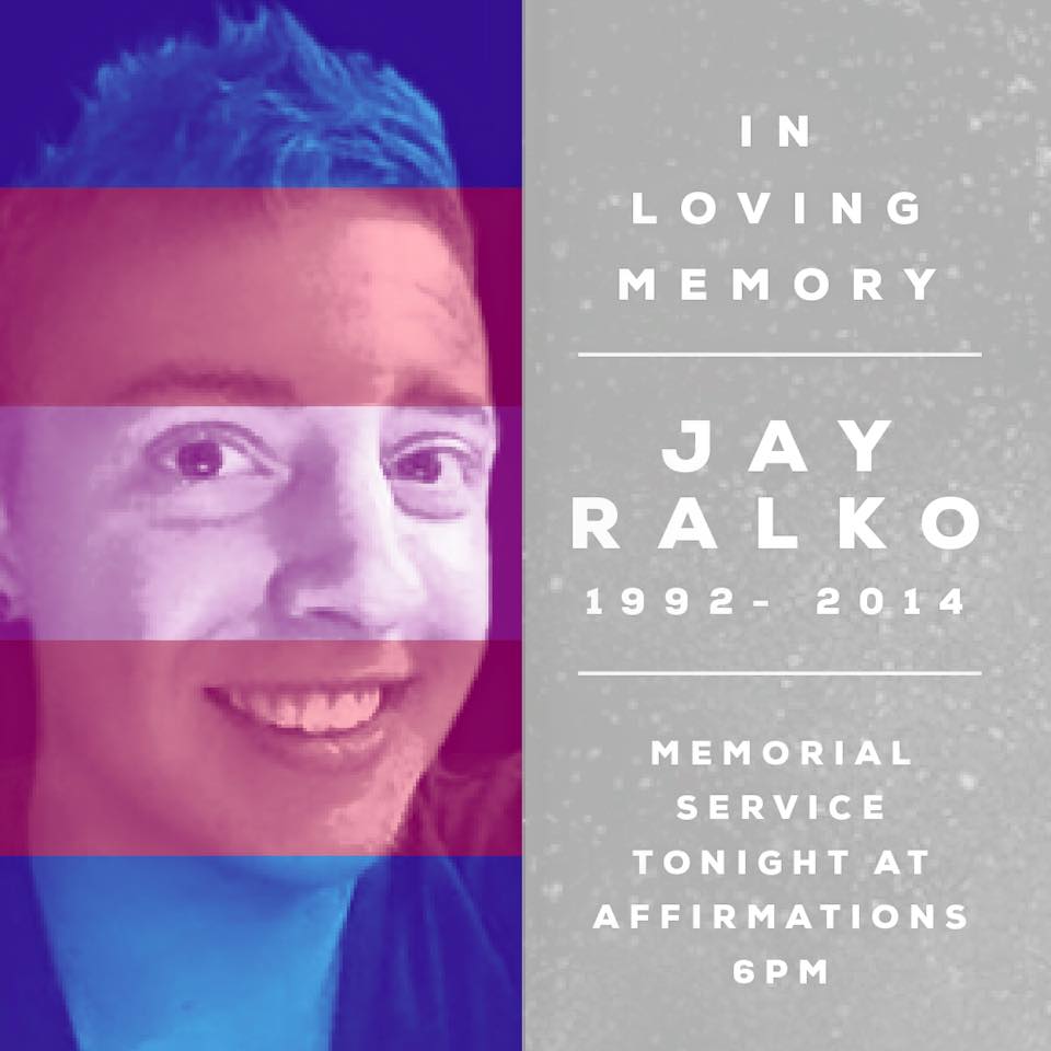 Jay Ralko, a young transgender man, took his life. Most knew him as the life of the party. He was fun and funny and always ready for a good time. What many never saw was the dark side. Jay suffered from bi-polar disorder. In December, he left his dog, his apartment and his friends and family without any warning. A hastily scrawled note was left for his roommate asking him to take the dog out.